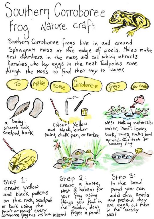 Create your own Southern Corroboree Frog by using natural materials. Then create a habitat and nest for it to live in.