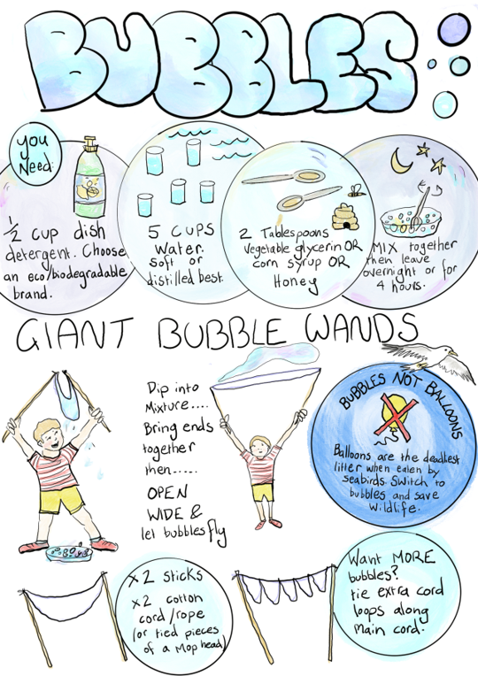 When ready, dip the bubble wands into mixture, bring ends together then open wide and let bubbles fly.